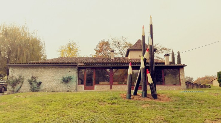 Cette sculpture a été inspirée de la rencontre des enfants. L’un d’entre eux taillait des brindilles de bois avec son taille-crayons pour faire de faux crayons. Cette réalisation est installée sur un site en pleine nature à 4 km de la Maison d’enfants. Le site des Majouans accueille la tranche d’âges de 8 à 12 ans.