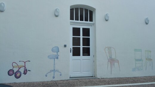 Peinture de chaises sur les murs de la Maison d’enfants de Port Sainte Foy et Ponchapt (24) associée à une installation de chaises en extérieur dont les enfants se sont saisis pour inventer des jeux.