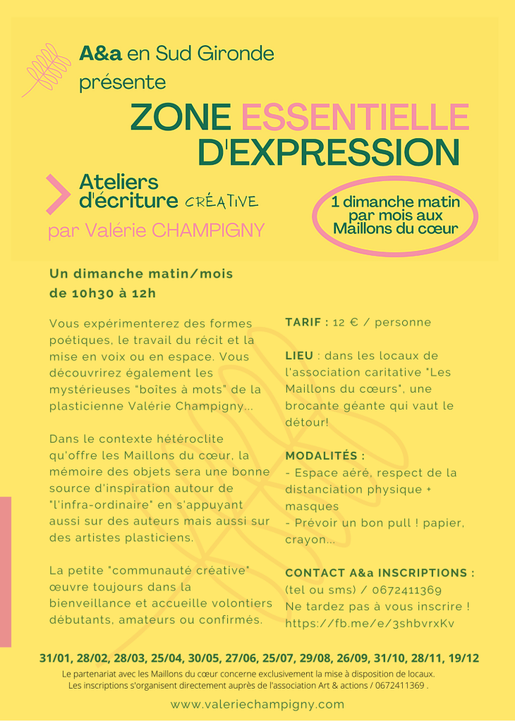 Zone essentielle d’expression- Ateliers d’écriture mensuel – Maillons du cœur Publié le 1501201810022021 par Valérie Champigny Ateliers d’écriture Valérie Champigny aux Maillons du cœur. Lien événement Fb (Rappel des dates) Lien article Sud Ouest Inscription par tel ou sms / 0672411369