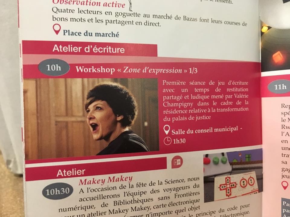 Valérie Champigny est jusqu’en 2019 en résidence de création « L’étais-je disculpé.e à » (son anagramme de « Palais de justice » en néon en référence à Thérèse Desqueyroux) à la Médiathèque de Bazas dans le cadre de la transformation du palais de Justice en Pôle de l’Image, de l’Écrit et du Numérique.