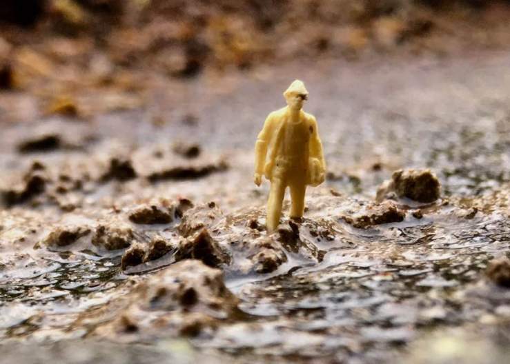 Changer d’échelle m’est apparu la solution pour penser le confinement et le déroulement du temps différemment. En retrouvant une dizaine de figurines de 6 à 8 mm de haut, mon sujet s’est peu à peu orientée sur la mise en scène de personnages dans les interstices du banal. C’est en parcourant mon environnement proche, en utilisant des fragments du réel, mais aussi les éléments naturels que la scène se constitue. C’est le plaisir de rester surprise par le potentiel des micro-mondes, en me projetant à une autre échelle dans chaque recoin, en restant à l’affut, en éveil permanent qui a définit le protocole pour la succession des jours confinés. C’est donc en général la trouvaille ou l’évènement du moment qui fait projet et non l’inverse. Tout nouvel élément collecté devient habitat, refuge, paysage… un échappatoire où souvent la nature prend part. La présence humaine est ramenée à la taille du cloporte, à ses conditions de suivie. Ces images associent à la fois une forme de déconnexion ou bien évolue dans une nécessité de faire écho à l’actualité mais tout en témoignant de la particularité de la journée. Au fil des expériences, la technique s’est enrichie tout en préservant la fragilité du dispositif qui génère l’improbable.