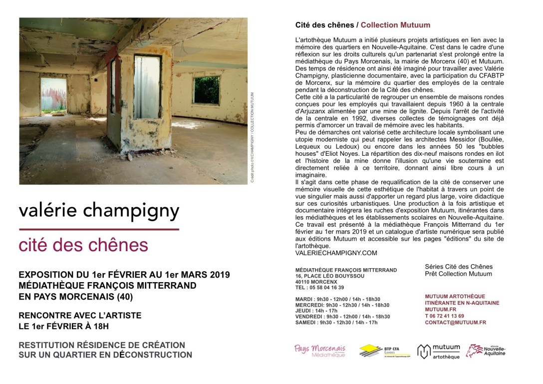 L’artothèque Mutuum a initié plusieurs projets artistiques en lien avec la mémoire des quartiers en Nouvelle-Aquitaine. C’est dans le cadre d’une réflexion sur les droits culturels qu’un partenariat s’est prolongé entre la médiathèque du Pays Morcenais, la mairie de Morcenx (40) et Mutuum. Des temps de résidence ont ainsi été imaginé pour travailler avec Valérie Champigny, plasticienne documentaire, avec la participation du CFABTP de Morcenx, sur la mémoire du quartier des employés de la centrale pendant la déconstruction de la Cité des chênes.
